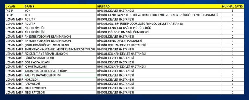 Bu kapsamda: Bingöl Devlet Hastanemize; Acil Tıp, Adli Tıp, Anesteziyoloji ve Reanimasyon, Enfeksiyon Hastalıkları, Göğüs Hastalıkları, Göz Hastalıkları, Kadın Hastalıkları ve Doğum, Kalp ve Damar Cerrahisi, Nöroloji, Radyoloji, Tıbbi Biyokimya ve Tıbbi Patoloji branşlarında uzman hekimler atanacaktır. Ayrıca 7 pratisyen hekim görevlendirilecektir.